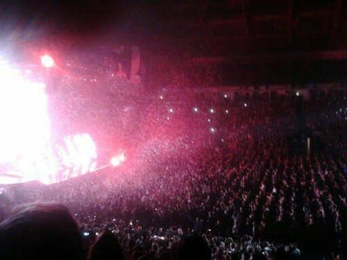 Esgotadíssimo, como se pode depreender. Na segunda foto podemos ver o que parece ser o 'pit' onde as camaras fixas que transmitiam para os jumbotrons e a demais parafernália era 'comandada', e onde estavam os acompanhantes do artista e dos músicos, e que ficava na ooooouuutraaa ponta da Arena.